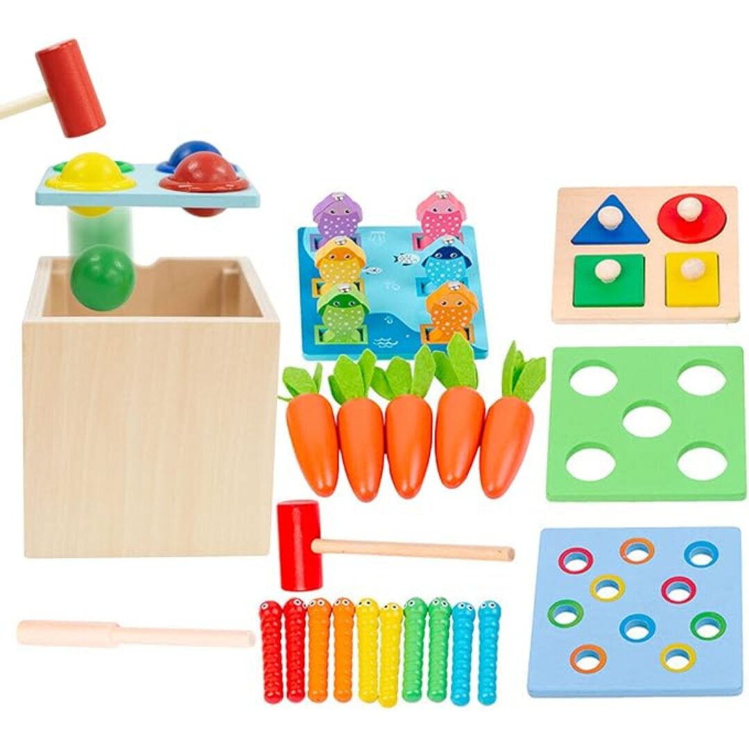 5 in 1 Wooden toy combines five exciting play possibilities for children, including hammering toy, fishing game, carrot harvest toy, shape sorter and insect catching game. Children can experience a variety of engaging activities in a toy while developing their fine motor skills and shape recognition.