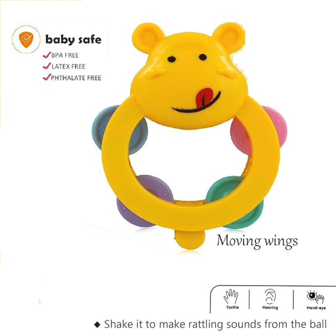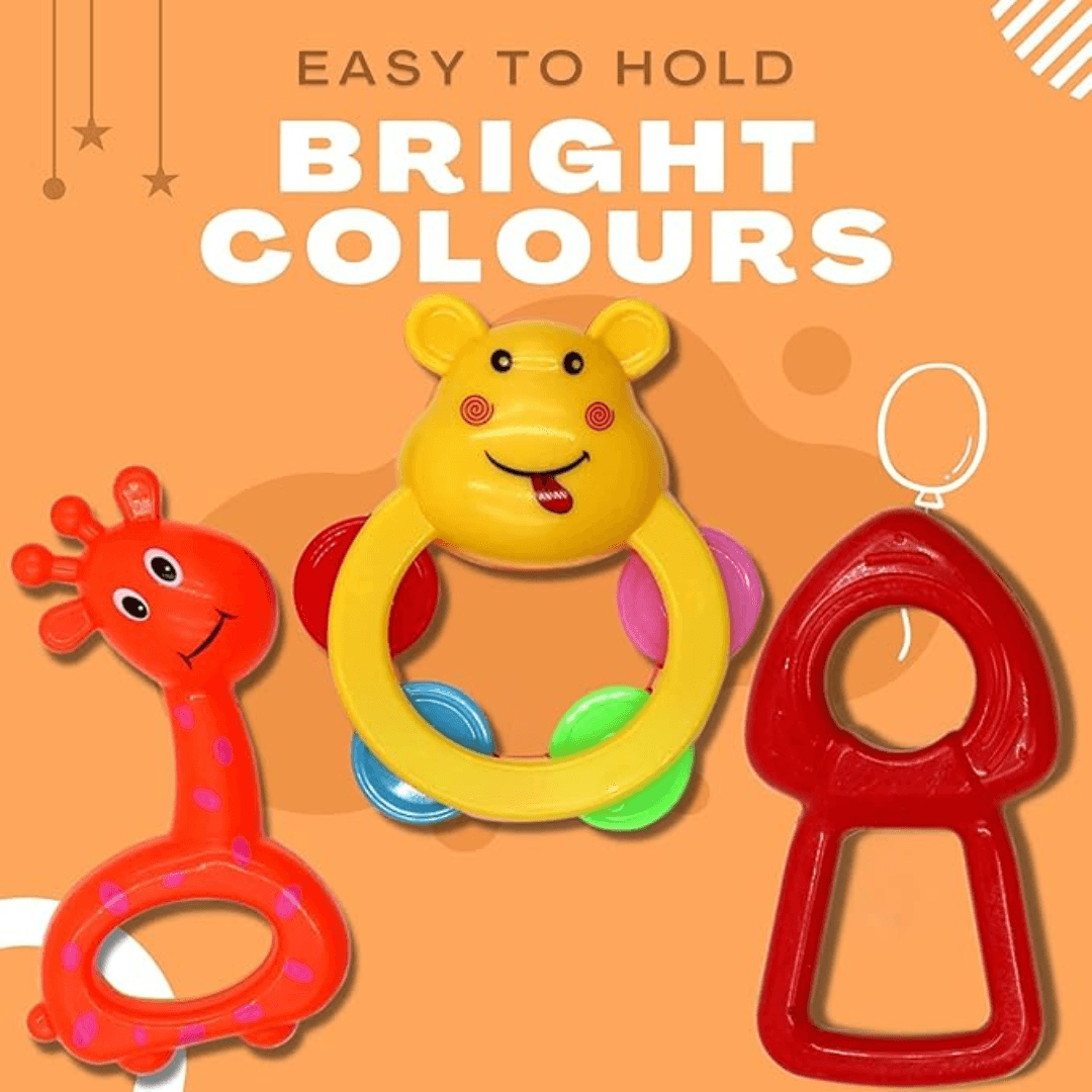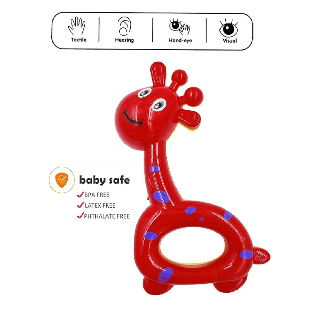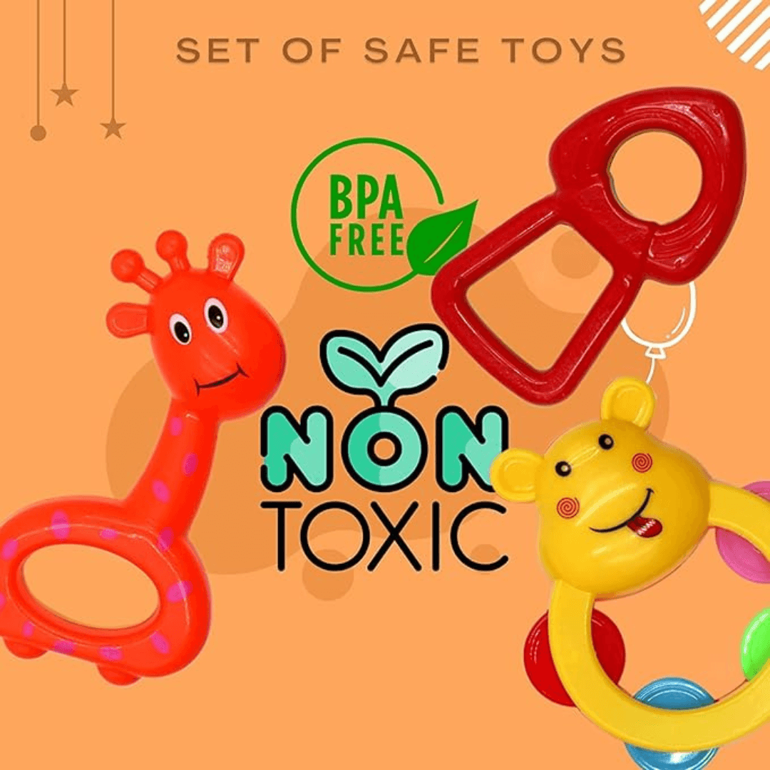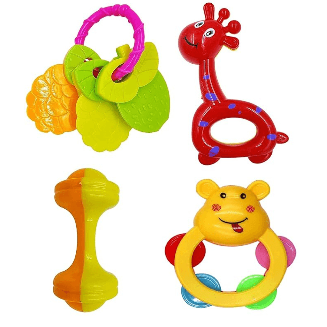 The Baby Rattles Toy set includes four brightly colored rattles, each with unique shapes and designs to captivate your baby’s attention. Made from safe, durable plastic, these rattles are perfect for little hands to grasp and explore. When shaken, they produce delightful sounds, including crinkling noises, which engage your baby’s auditory senses and keep them entertained.