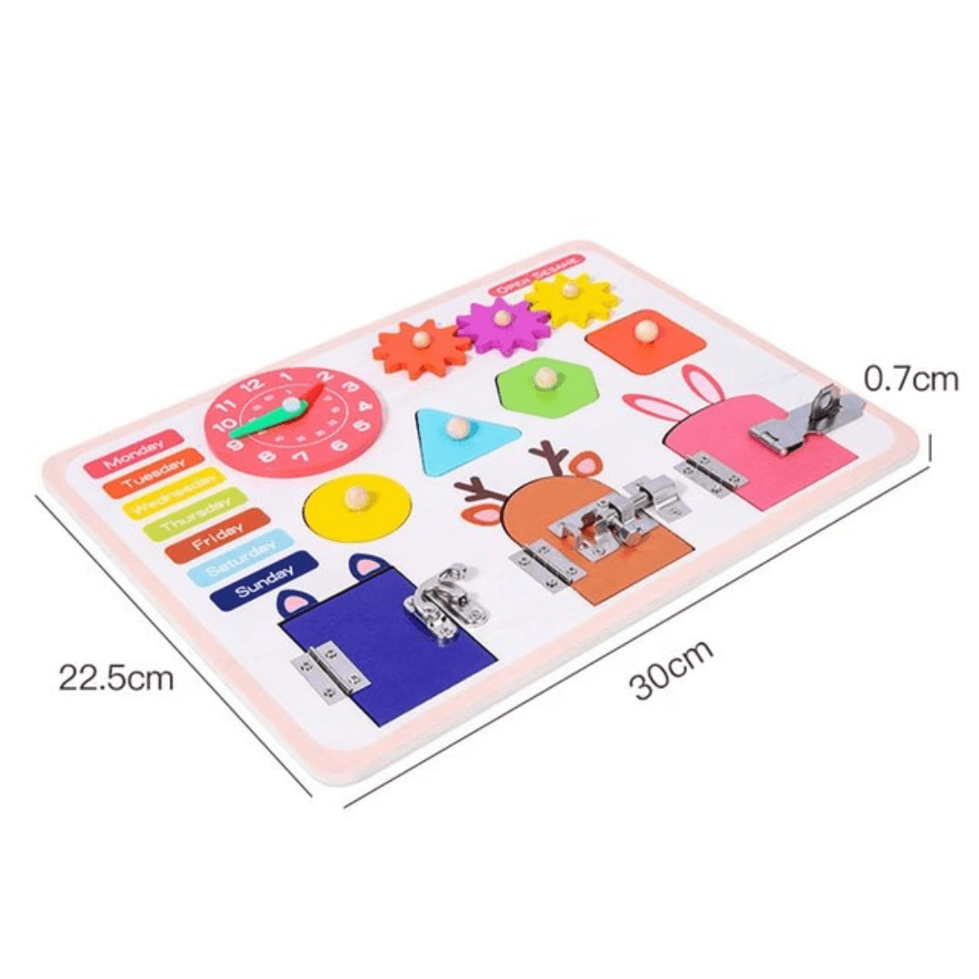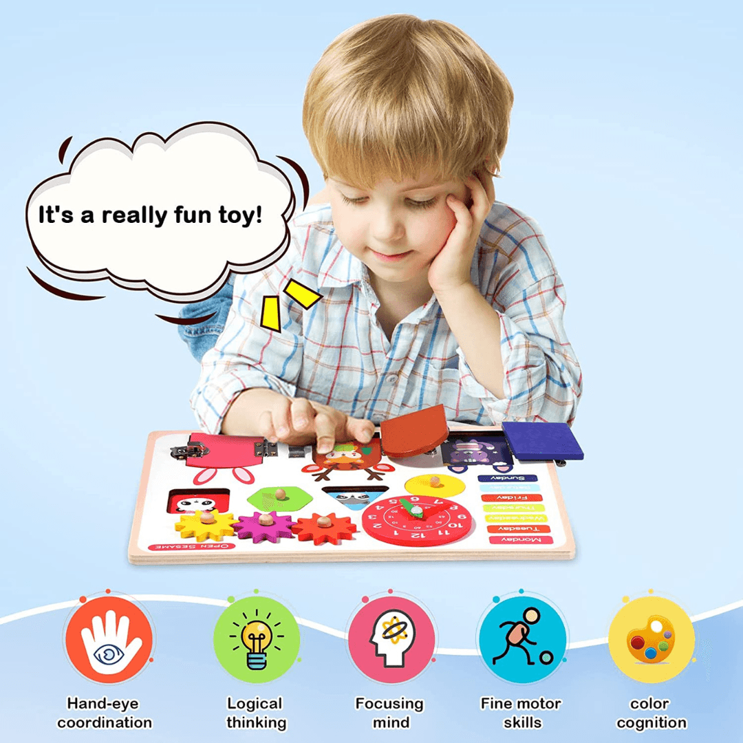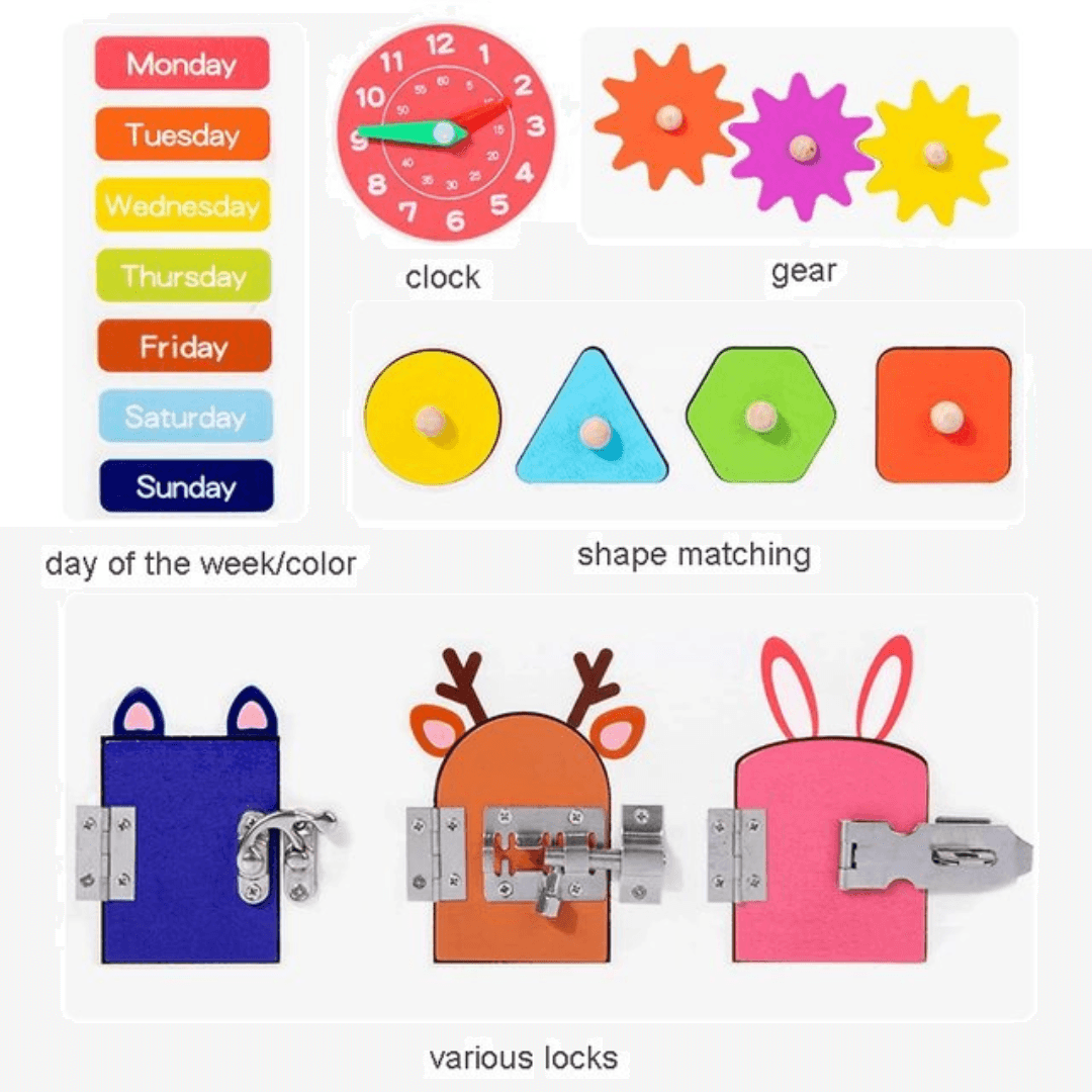 Busy Boards is an excellent tool designed to promote the development of toddlers and children with special needs. It aids in the development of fine motor skills, cognitive abilities, and hand-eye coordination. By engaging with the various features, children can improve their ability to grasp, twist, and manipulate objects, which are essential skills for daily life.